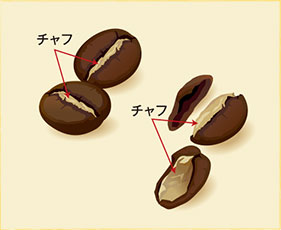 精製後のコーヒー豆では、乾ききった周乳が薄い皮膜になって生豆の表面を覆うとともに、生豆中央の溝(センターカット)の内部を埋めています。この皮膜をシルバースキンといい、焙煎後にはチャフと呼ばれます。