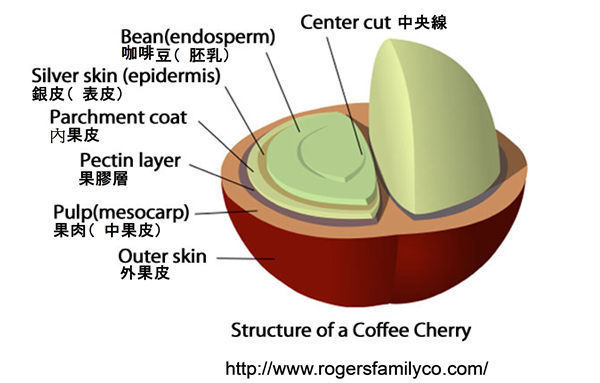 コーヒーの種子、つまりコーヒー豆は幾重もの層に覆われたかたちで果実の中心に収まっています。