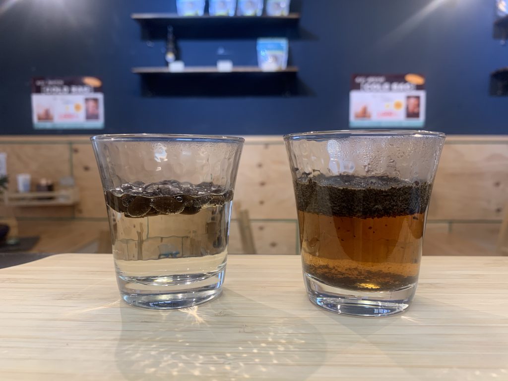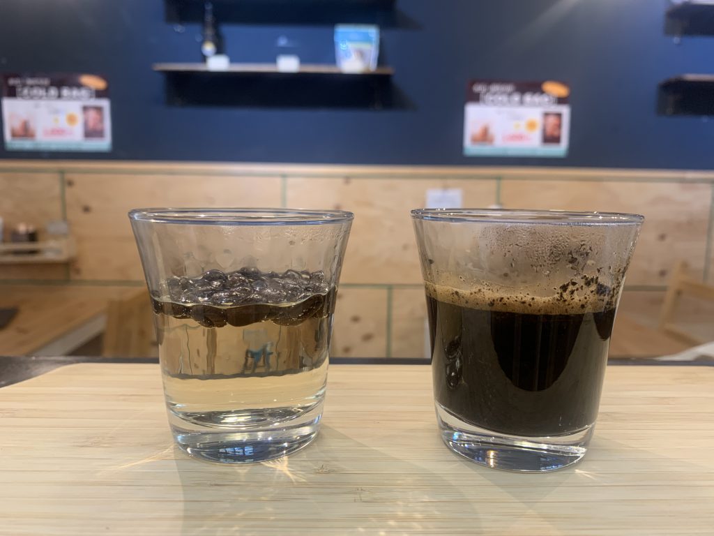 同じ分量のコーヒー粉と豆を、同じ温度のお湯に浸した実験です。