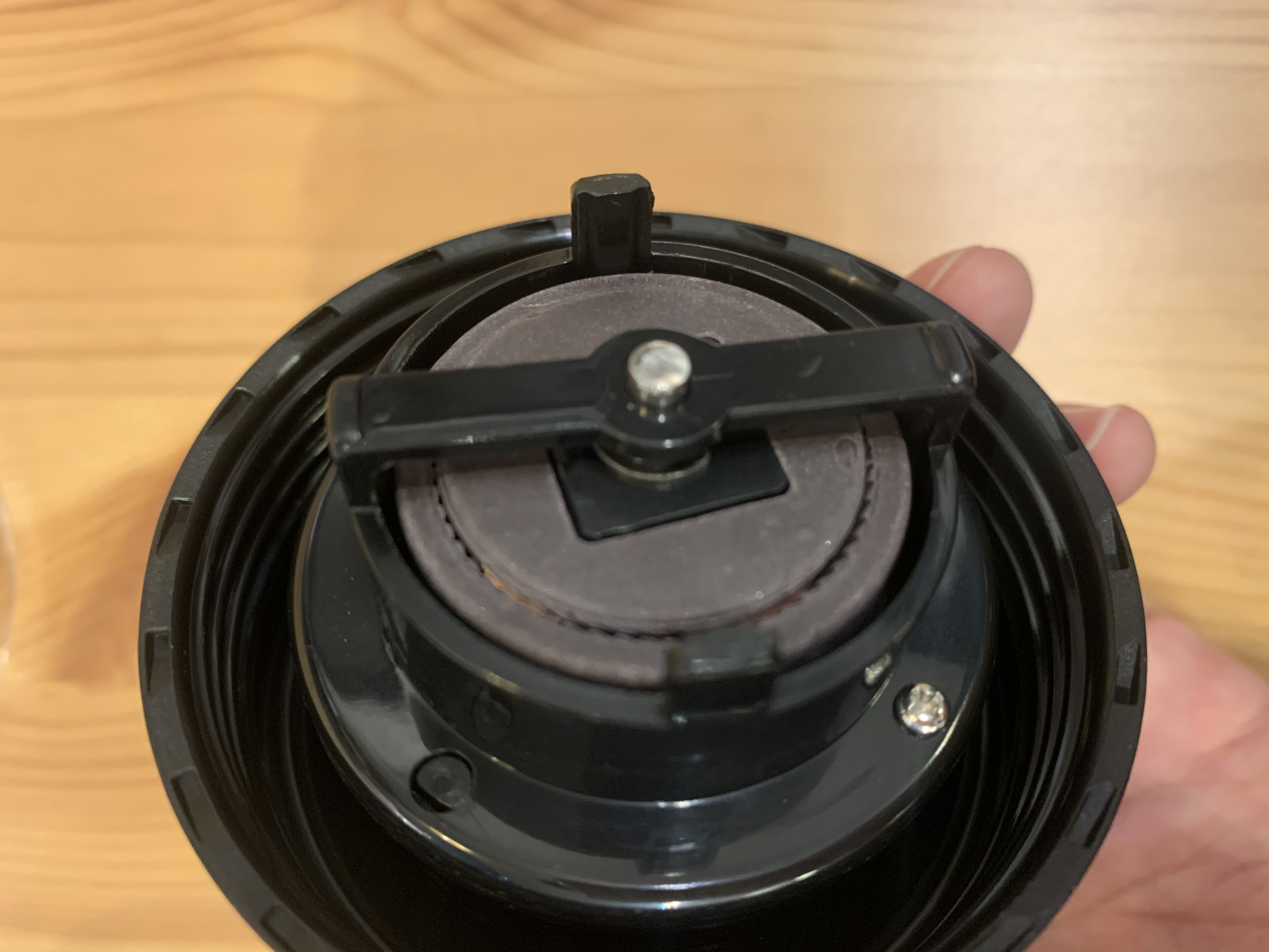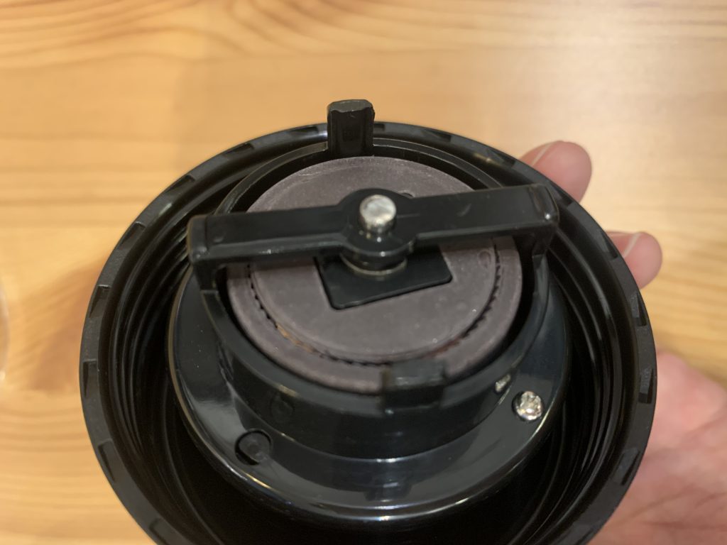 多くのハンドミルは本体を分解して、裏面中央に付けられたネジを回す事で挽き目の調節をします。