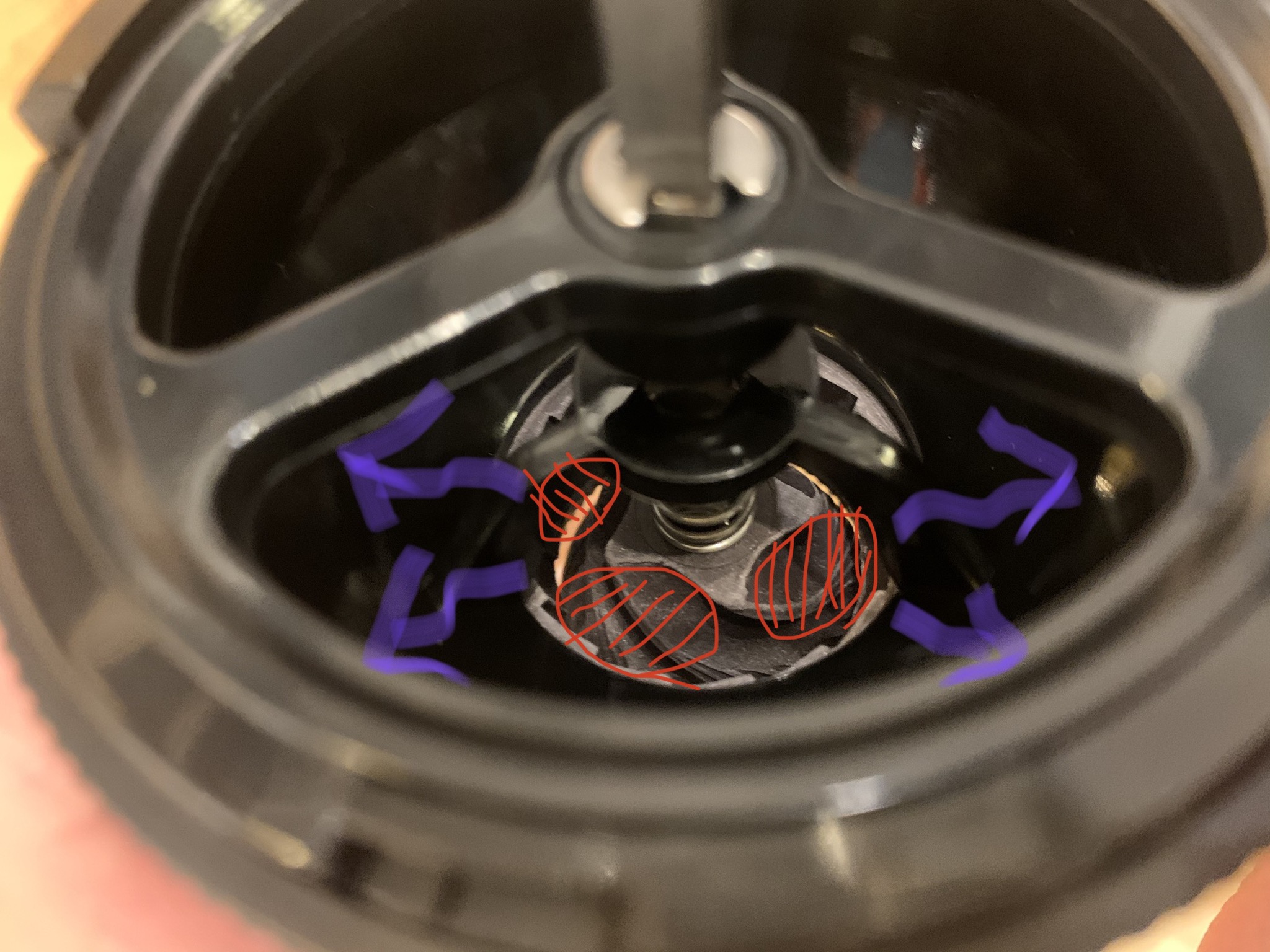 断言できませんが、写真の赤で塗られたポケットが小さい為に、コーヒー豆がなかなか入り込めず上へ逃げてしまっているのかもしれません。