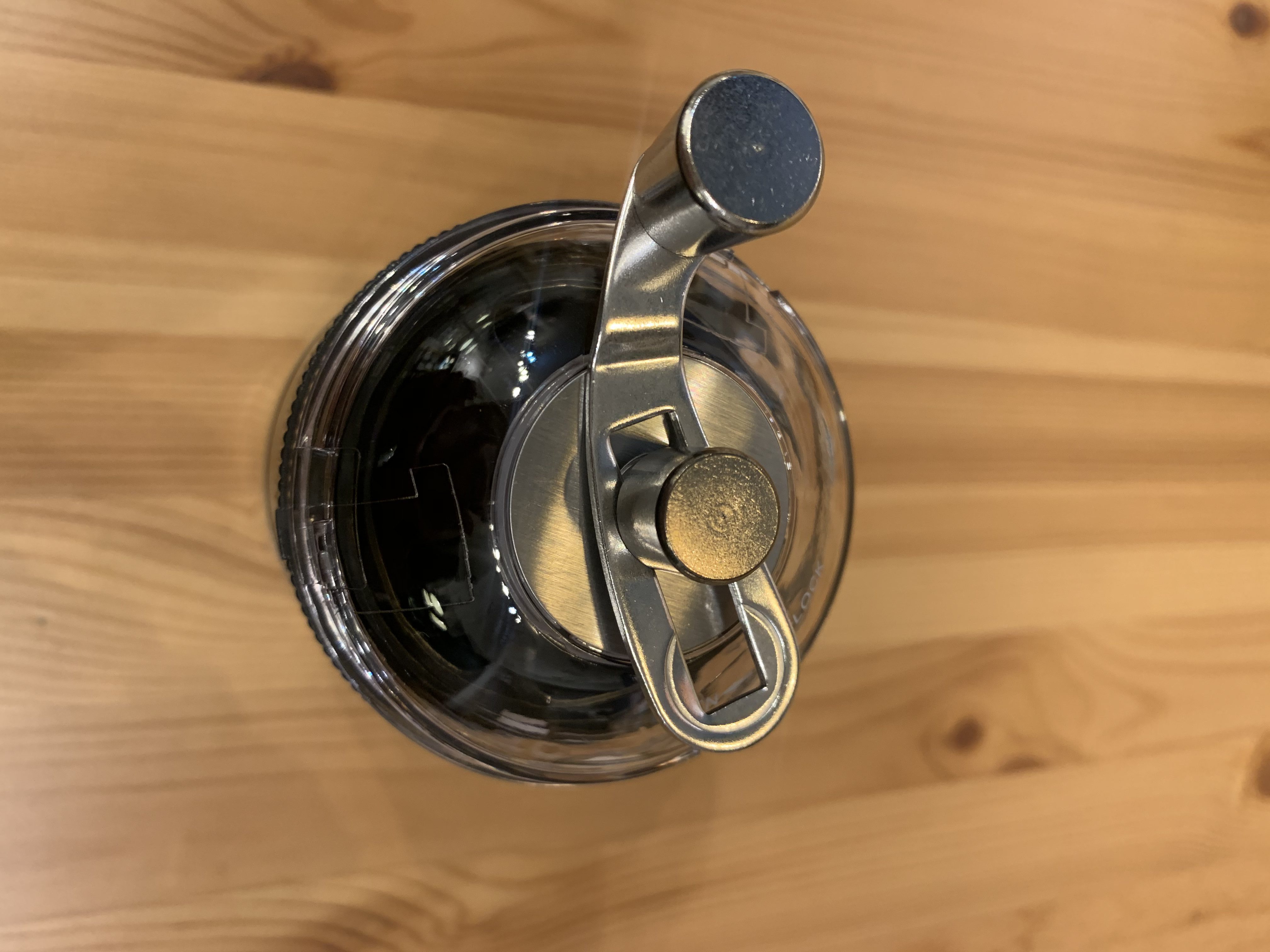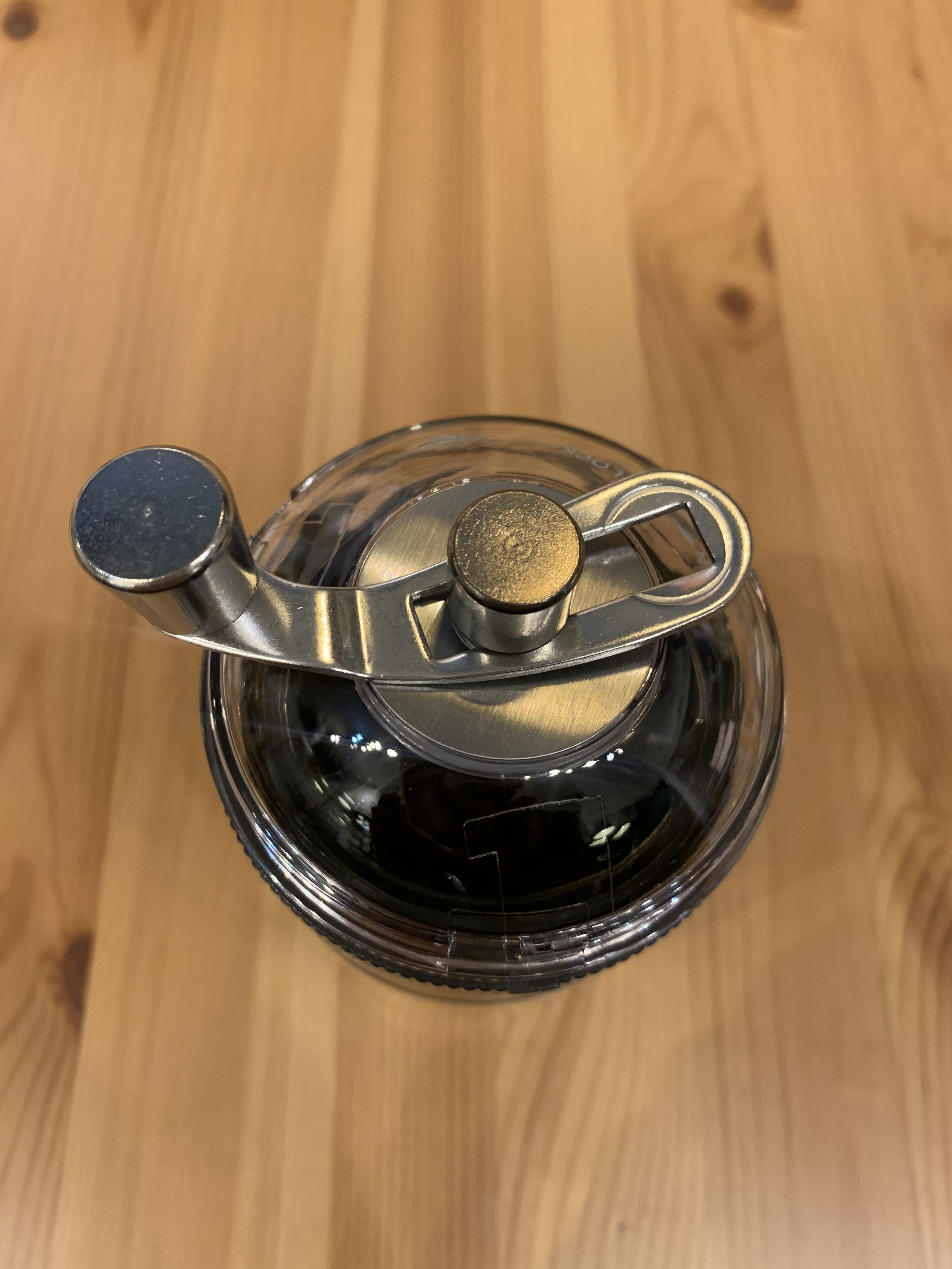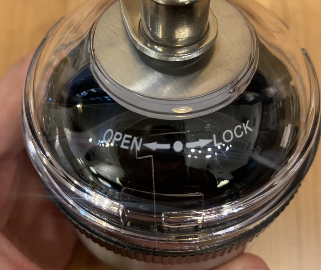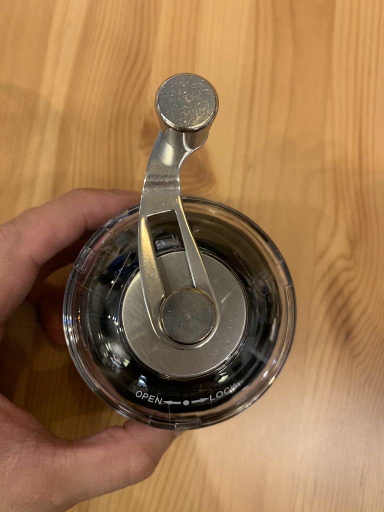 「OPEN」⇔「LOCK」と見える通り、上蓋を回すだけで簡単に取り外し・コーヒー豆の投入ができます。