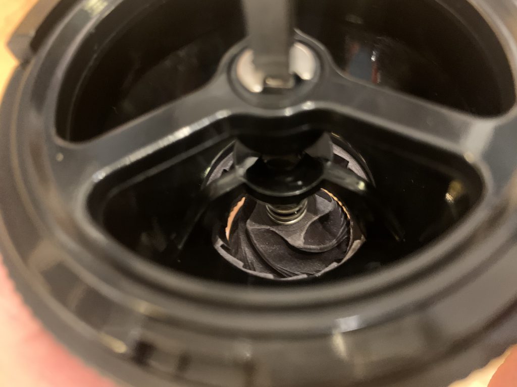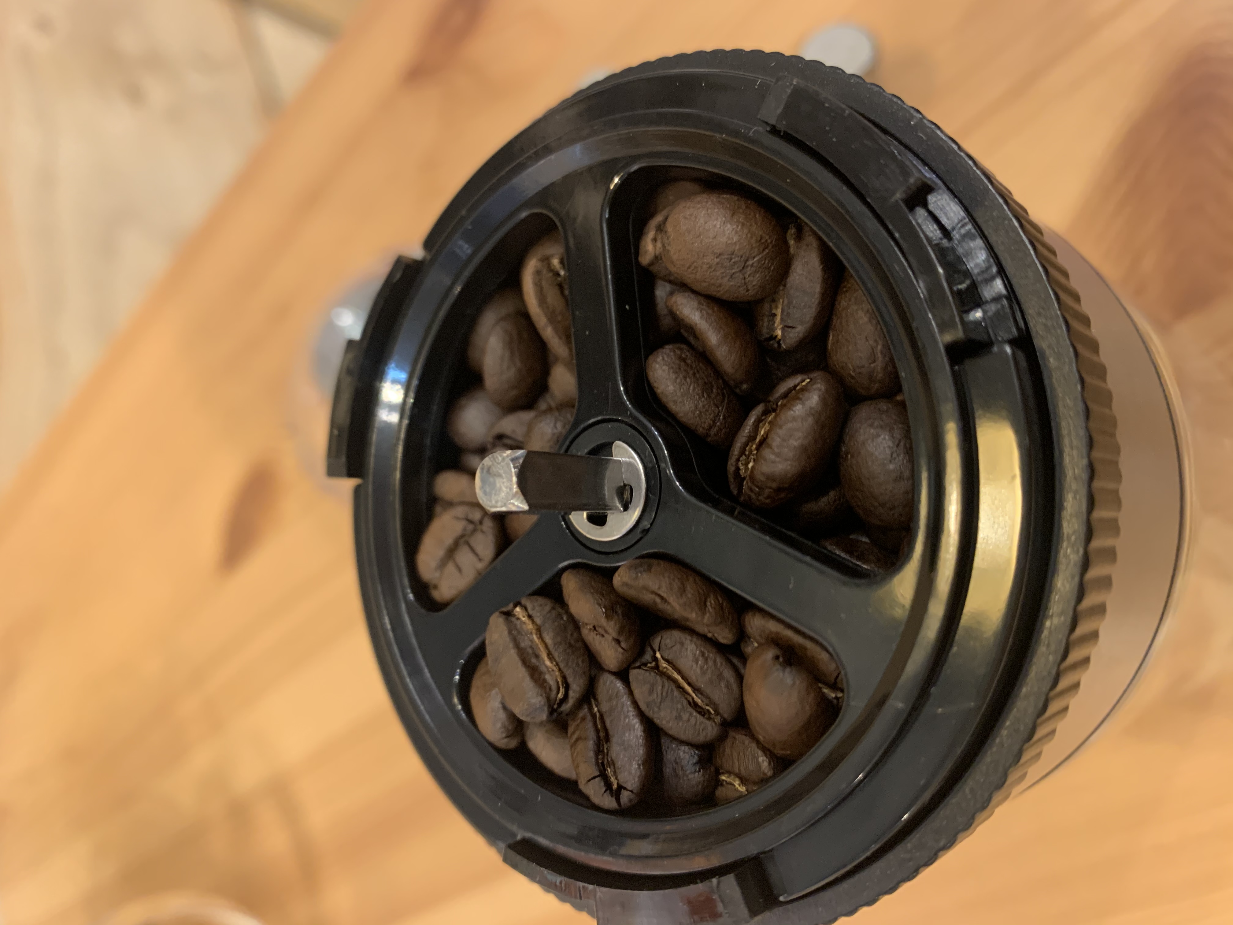 刃はこんな感じです。材質はセラミックでしょうか? 刃のすぐ上にも横柱があって、挽いてるときにコーヒー豆が浮き上がるのを防ぐ効果もあります。