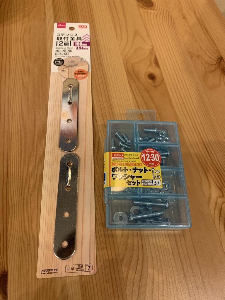 同じく100均で購入した「取り付け金具」と「ボルト・ナット・ワッシャー」です。